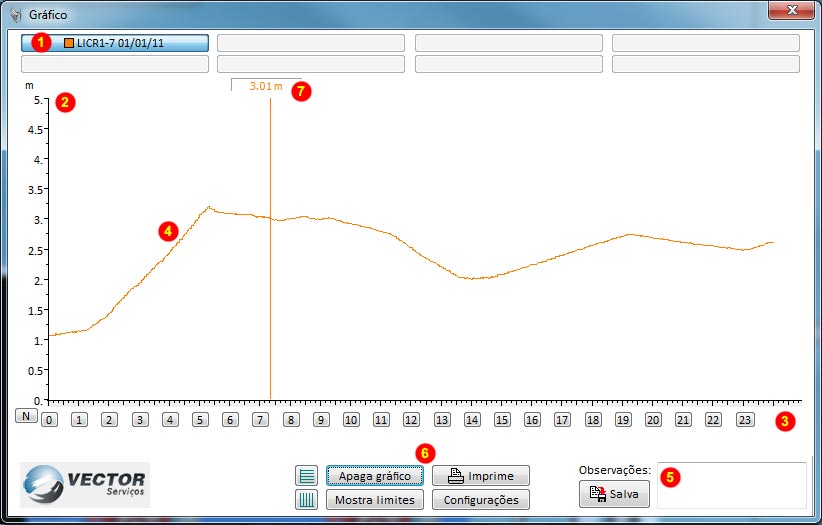 Quando selecionado o instrumento, clique no fundo da janela para aparecer uma régua vertical, ajudando o operador a visualizar os valores em detalhe diretamente na linha do gráfico.