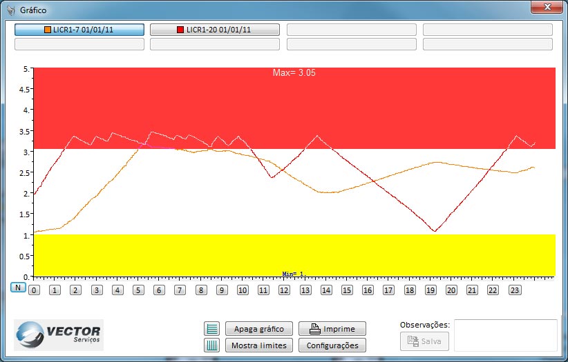 Linha de tempo do gráfico, começando às 00:00h, até 23:00h. (esse horário é configurado).