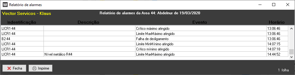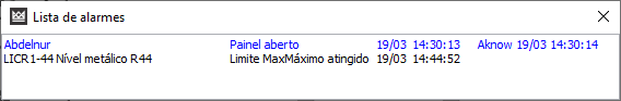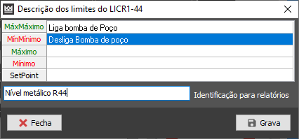 Identificação para Relatório: Pode digitar qualquer descrição, fazendo esse texto aparecer na Janela de Alarmes, e Relatório de Alarmes: